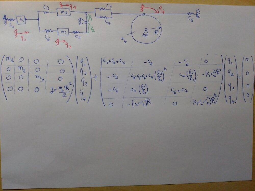 I tried to find the equation system of the joined Mechanism (4 DoF). I think there is a mistake but I am not sure where is it . I have used the Lagrange Formalism to determine the equations. Can anybody please help me with the verification, if it is correct . Thank you very much for your help :)
