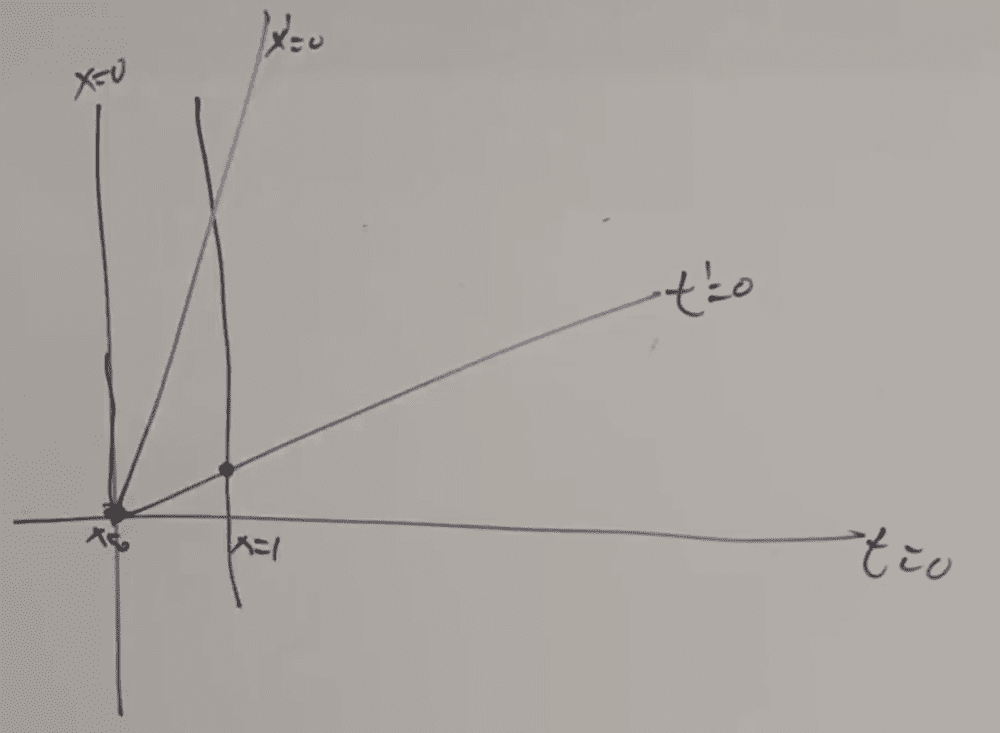 The lines corresponding to x' = 0 and t' = 0 are drawn on the spacetime diagram below (from the Theoretical Minimum lecture series)