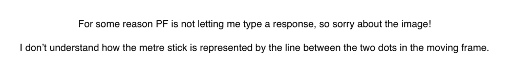 He says that the length of the metre stick in the moving frame of reference is represented by the distance from the origin to the intersection of the lines x = 1 and t' = 0 (between the two dots). I can't understand why this is the case.