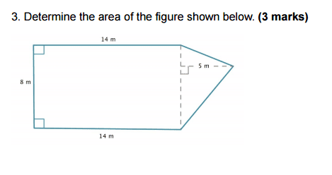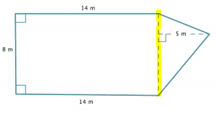 To find the area of a rectangle you would use the formula "A = L x W". In this case A = 14 x 8 which is eual to 112, Now all i need is the area of the triangle and then i add them together and that will be the area of the whole figure.