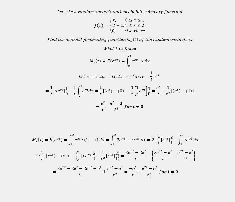 - One participant clarifies the formula for the MGF as \(M_X(t) = E(e^{tX}) = \int_0^2 f(x)e^{tx}dx\) and notes the importance of summing contributions rather than splitting them.