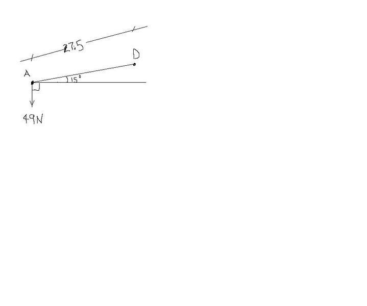 I know the radius between A and D is 27.5cm but I'm not sure how to find out how much of the force is actually acting on D! I know I need to use sin or cos of a deduced angle (15 degrees or one relating to that). I'm not sure which trig operation or angle to use.