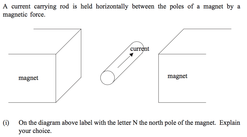 The discussion revolves around determining the north pole of a magnet using the right-hand rule in the context of a current-carrying rod positioned between the poles of a magnet. The original poster seeks clarification on the application of the right-hand rule and its relevance to the magnetic field and force interactions.