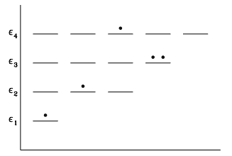 Well, take your picture. There are 5 particles and the sum of energies is 13 x E1, so it doesn't qualify for the answer, but as an example: let's count the number of ways we can arrange these particles over the four energy levels.