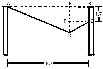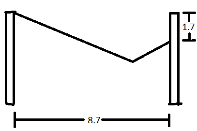 As a stunt coordinator with a background in physics, you have been asked to determine whether Man can make it across the river and whether the rope will hold his weight. Man is rather small, with a mass of only about 48.7 kg, including his equipment. The crossing distance is roughly W = 8.7 m and the rope is tied H = 1.7 m lower on the opposing the bank. Judging by the sag in the rope, its length is about 11.5 m. Calculate the tension in the rope once man reaches a point of equilibrium. Assume the rope does not stretch.