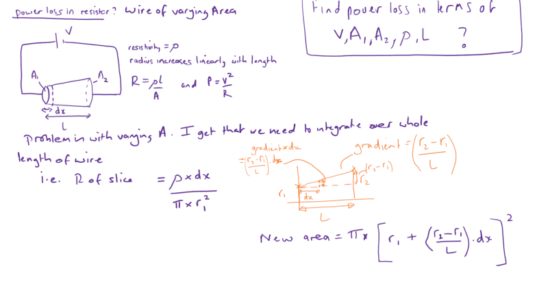 Hopefully you can see in the diagram below that the area of the wire varies linearly with length. I know the equations for resistance and power loss and I can express the resistance of a thin slice but need to integrate over the whole wire to get the full resistance - to find power then it is trivial. I've thought about this for a good while now but can't get it. Please help, this isn't homework (I'm very old and doing this for fun!)