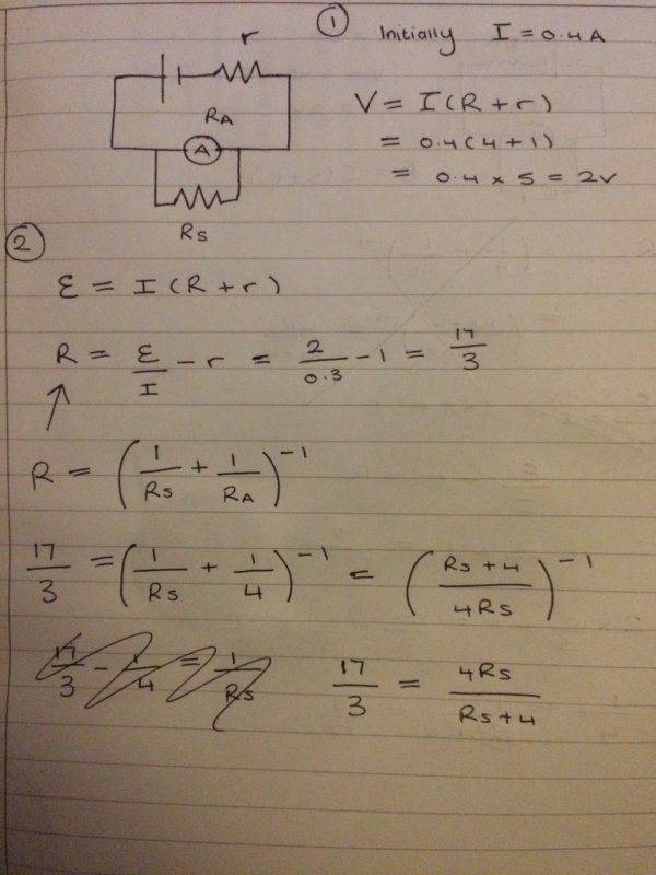 The discussion focuses on calculating the resistance of a shunt resistor placed in parallel with an ammeter. The relevant equation used is the electromotive force (emf) equation, E = I(R + r), where E represents the battery voltage. Participants clarify that the current through the ammeter decreases from 0.4 A to 0.3 A, leading to a current of 0.1 A through the shunt resistor. The final calculation yields a shunt resistance (Rs) of 2.4 ohms, derived from the voltage across the shunt and the current flowing through it.