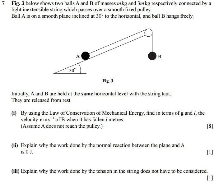 So I said that for B, the PE at the start is mgl and at the end it is considered 0. For its kinetic energy, at the start it is 0 and at the end it is 0.5mv^2. I also realize that it is subject to resistance from the tension in the string, so I resolved the forces to 3mg - T = 3ma (For B) and T - mgSin30 = ma (for A). From this I solved for T to get T = 9/8mg. Then I calculated the work done against tension as WD = -9/8mgl.