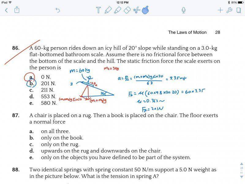 A 60-kg person rides down an icy hill of 20° slope while standing on a 3.0-kg flat-bottomed bathroom scale. Assume there is no frictional force between the bottom of the scale and the hill. The static friction force the scale exerts on the person is