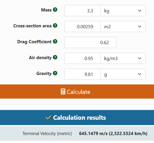 Ok, for the Cd and 200m/s that makes sense. I was thinking it was either that or vt. I have loved every step of this project because i have learned so much from you guys.