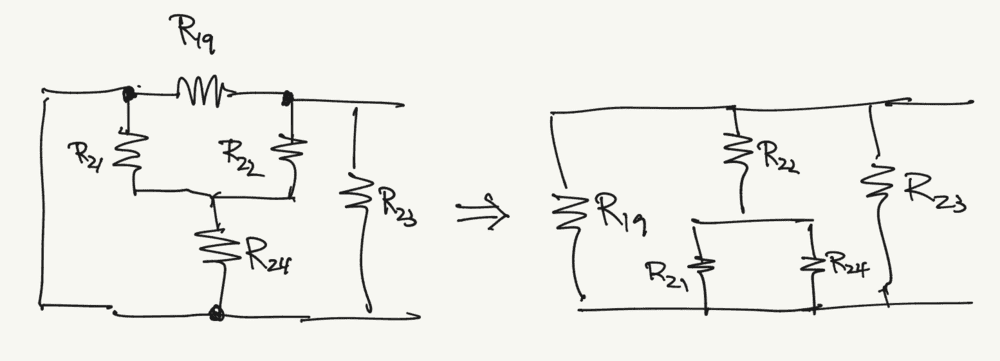 To me, R23 is in parallel with R22+R24, but it is not clear to me how this relates to R21 and R19.