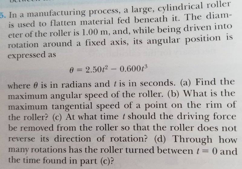 I solved this with help from Chegg study, however, I'm still not entirely sure what I am doing. Obviously, for part a, you differentiate the position to get the angular velocity which is w=5t-1.8t2. At that point I struggled. Chegg answers simply differentiated twice to find the time of maximum angular speed as 1.39 s. Is that because ∝=5-3.6t gives the time of maximum acceleration? and therefore max speed?