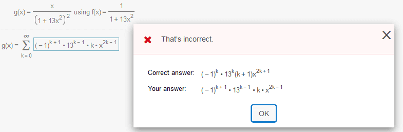The discussion revolves around a power series problem related to a math homework platform's requirements. The original poster is attempting to reconcile their result with the platform's expected format, particularly regarding the starting index of the summation.