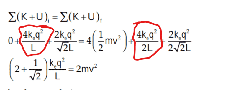 ##\frac{4k_eq^2}{\sqrt{2}L} = \frac{4k_eq^2}{2\sqrt{2}L} + 4(\frac{mv^2}{2}) ##