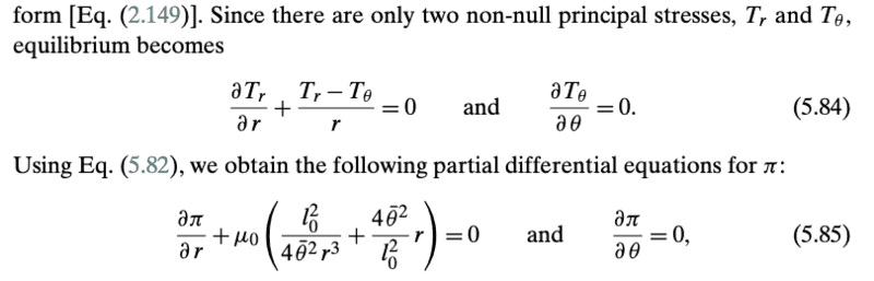 Since there are only two non-null principal stresses, ##T_r## and ##T_θ## , equilibrium becomes ##\frac{\partial T_r}{\partial r} + \frac{T_r - T_{\theta}}{r}=0 \quad \frac{\partial T_{\theta}}{\partial \theta} = 0##