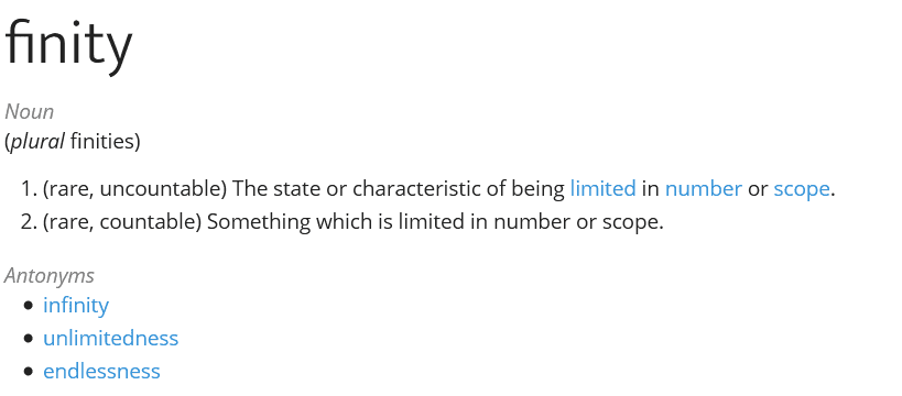 - There is a claim that finite implies a measurable amount with a beginning and an end, while infinite is treated as a composite rather than a direct opposite of finite.