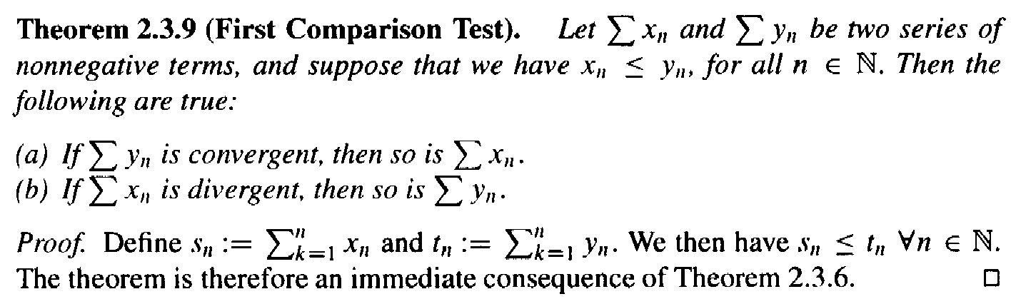Now, we can prove Theorem 2.3.9 (a) using the Cauchy Criterion for Series ... as follows:Since $$0 \leq x_n \leq y_n \ \forall \ n \in \mathbb{N}$$ ... we have that ...$$\left\vert \sum_{ k = n + 1 }^m x_n \right\vert \leq \left\vert \sum_{ k = n + 1 }^m y_n \right\vert$$ ... ... ... ... ... (1)But ... since $$ \sum_{ n = 1 }^{ \infty } y_n $$ is convergent, it satisfies the Cauchy Criterion for Series ...... further ... (1) implies that $$ \sum_{ n = 1 }^{ \infty } x_n $$ also satisfies the Cauchy Criterion for Series ... ... and so $$ \sum_{ n = 1 }^{ \infty } x_n $$ is convergent ...