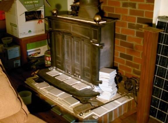 Not knowing how to stick/glue/mortar tile, I stacked them against my wood stove: Heat sink!
