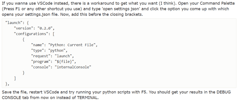 - A workaround is proposed for configuring VS Code to suppress terminal output and display results in the DEBUG CONSOLE instead.