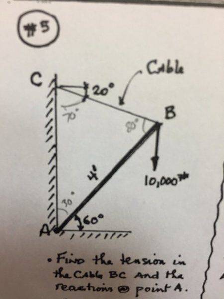Sum of moments (from A) = 0, so is the formula: 0 = 4*10000sin30 - 4*Tsin80 (or 0 = MomentA + 4*10000sin30 - 4*Tsin80?)[/B]