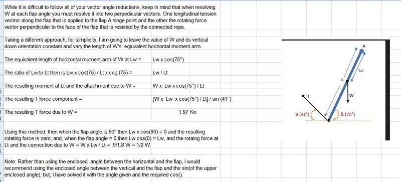 I have looked through previous questions and a lot seem to relate to a horizontal flap being lifted and i am struggling to get my head around things when rotated 90deg.I assume that tension is zero when the flap is just hanging down on its own and is a maximum when the flap is fully open (90deg) but I am struggling to make this work.