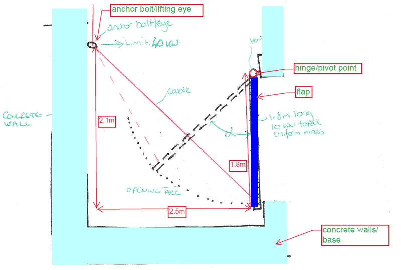 2.5m away and 0.3m above height of the hinge is an anchor bolt, to which i will connect a lifting block. I then intend on lifting the flap with a single rope through this block.