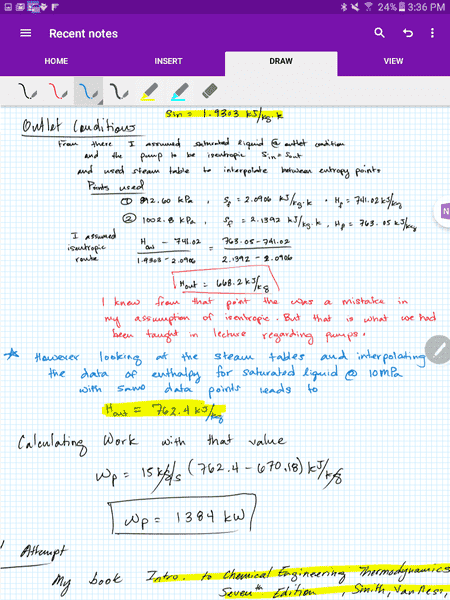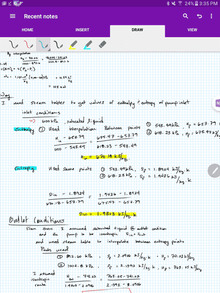 I interpolated from the data a value for my entropy (1.93) and since I know it to be isentropic I used that point to find a value for enthalpy. My problem is doing that route I get a smaller value of enthalpy going out because the entropy data points for my interpolation are larger than my calculated value. This result leaves me with a negative value for work which I know to be wrong.I did however attempt it another way with the approach of knowing it to be a saturated liquid at the outlet @10MPa which gave me a different value of enthalpy leaving me with a positive value for work.