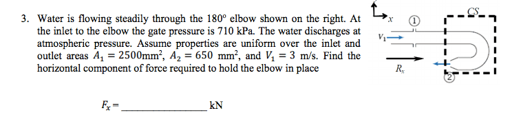 The discussion centers on the application of fluid mechanics principles to solve a problem involving the conservation of momentum. The user initially employed the formula Fx=p*u1*A1(u1+u2)+(p1*a1)+(p2*a2) but failed to achieve the expected result of 1.8 kN. Key corrections highlighted include the need to recognize atmospheric pressure as 0 Pa relative to gauge pressure and the proper application of the continuity equation for determining outlet velocity. The user was advised to clarify the forces acting on the fluid within the control volume and to correctly apply the conservation of momentum equation.