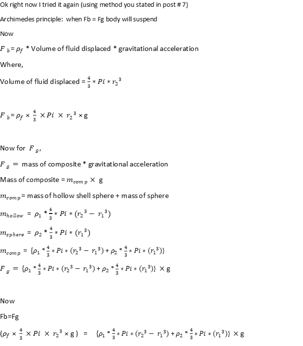 1. What should be the size of object/Particle (sphere) so that it should remain suspended (neither it should sink nor it should float)? container dimensions 30*25*25, density of fluid 0.9g/cm3 , density of particle 0.86g/cm3 , particle is coated with aluminium having density of 2.07g/cm3.(if radius is assumed then find out at what height it remains suspended in a container)2. area of sphere, area of hollow sphere , bouyouncy force, conditions for floating,sinking and suspension.3. Fb = Fg for suspended particle , where Fb = density of liquid * volume of displace water * gravitaional acceleration