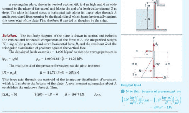 The rectangular gate shown in section is 3 m long (perpendicular to the paper) and is hinged about its upper edge B. The gate divides a channel leading to a fresh-water lake on the left and a salt-water tidal basin on the right. Calculate the moment, M, on the shaft of the gate at H required to prevent the gate from opening when the salt-water level drops to h = 1 m. Take the density of salt water 1050 kg/m3