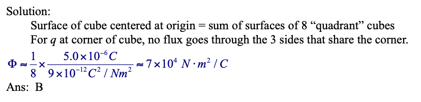 - A particle with charge 5.0 micro-coulombs is placed at the corner of a cube. The total electric flux through all sides of the cube is: