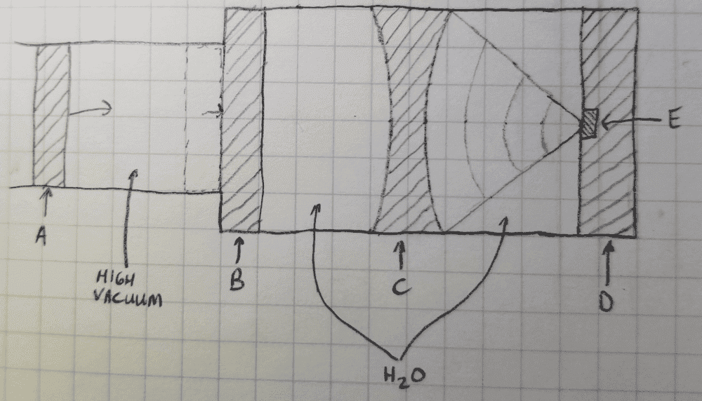 I am trying to come up with a design for a device that can generate very high and very brief waves of pressure directed at a 1 mm diameter target (shown as "E" in "Diagram.PNG") housed in a steel support structure "D". The idea is to accelerate hammer "A" towards anvil "B" in a vacuum tube. The hammer and anvil are both made of steel. Over the course of a couple microseconds, the anvil will stop the hammer while at the same time creating a sharp longitudinal pressure wave in the water directed towards the acoustic lens "C". The acoustic lens is made of steel and should focus the pressure waves to a point at the center of target "E". The steel would be precision ground in order to minimize aberrations in the lens surfaces.