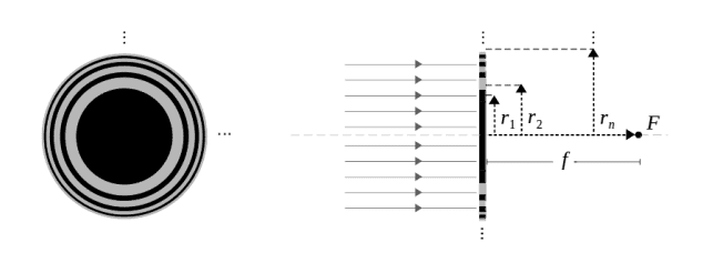 - Bob wants to focus a collimated monochromatic beam at a point F. Due to the small wavelength λ, he cannot use an ordinary converging lens to focus this radiation. As an alternative, he intends to use a diffraction grating made up of concentric rings round an absorbing (opaque) disc of radius r1. The concentric rings alternate between opaque/absorbing rings (the black ones in the images) and rings that let light through (the grey ones in the images).