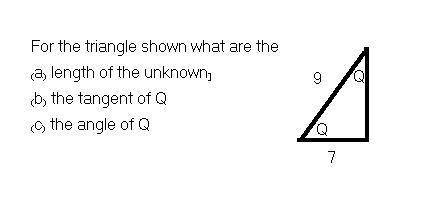 The discussion focuses on the calculations related to a triangle, specifically addressing the sides and angles. The initial formula for calculating side 'c' is incorrectly stated as "c = a2 - b2" instead of the correct "c^2 = a^2 + b^2." The calculation of tan(Q) is questioned, as the provided side lengths do not support the stated ratio of 2/7. Additionally, the mention of "sin = 9/7" is deemed nonsensical, as sine values cannot exceed 1. Overall, the responses emphasize the need for clarity in notation and accuracy in mathematical expressions.