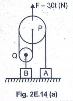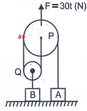 At moment ##t=0## a force ##F = 30 t (N)## starts acting on the pulley P along vertically upward direction as shown in the figure. Calculate,