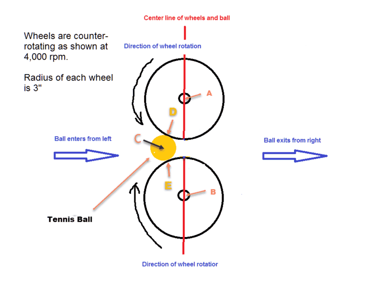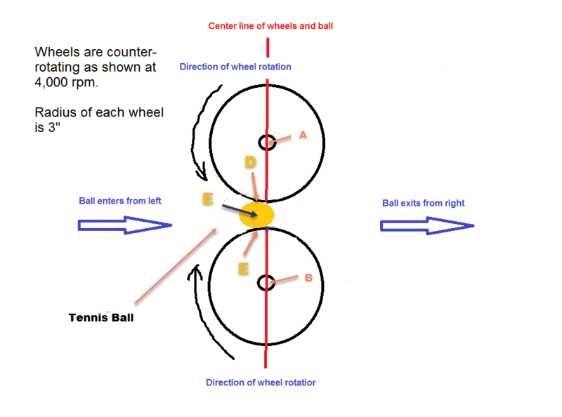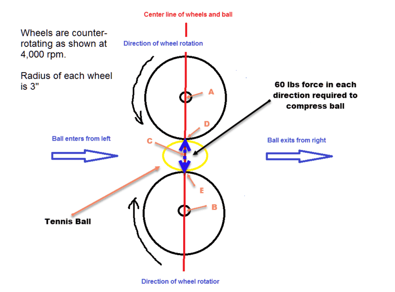 I am trying to figure out what torque is applied to 2 wheels counter-rotating at 4,000 rpm when a tennis ball is squeezed between them and then propelled forward (because the wheels are counter-rotating).This is how a tennis ball machine propels a ball forward. I know the distance between the edge of the counter-rotating wheels and I know how much force it takes to compress the tennis ball so it fits between the wheels, ie about 60 lbs, so I guess that's 30 lbs on each wheel. The traditional formula of Torque = Distance * Force * sin(theta) does not work because the force is being applied in line with the radius against the edge of each wheel towards the axle. Sin (0 deg) or sin (180 deg) in that equation are 0 so the equation yields 0 torque but that cannot be the case. It's kind of like applying breaks to the wheels of a car but not stopping. Radius of the wheel is 3".