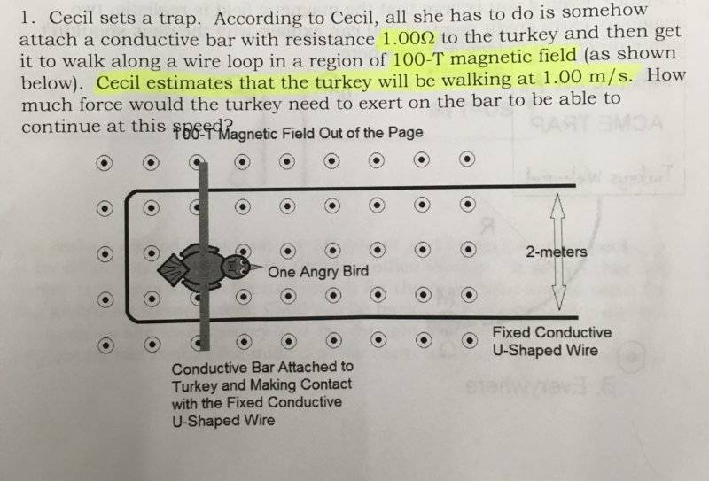 Ceicil sets a trap. According to ceicil, all she has to do is somehow attach a conductive bar with resistance 1Ω to the turkey and then get it to walk along a wire loop in a region of 100T magnetic field (as shown in turkeyforce.jpg). Ceicil estimates that the turkey will be walking at 1.00m/s. How much force would the turkey need to exert on the bar to be able to continue at this speed?