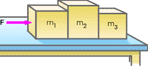 A force F = 91.4 N is applied to block 1 (mass m1). Determine the acceleration of the system (in terms of m1, m2, and m3).