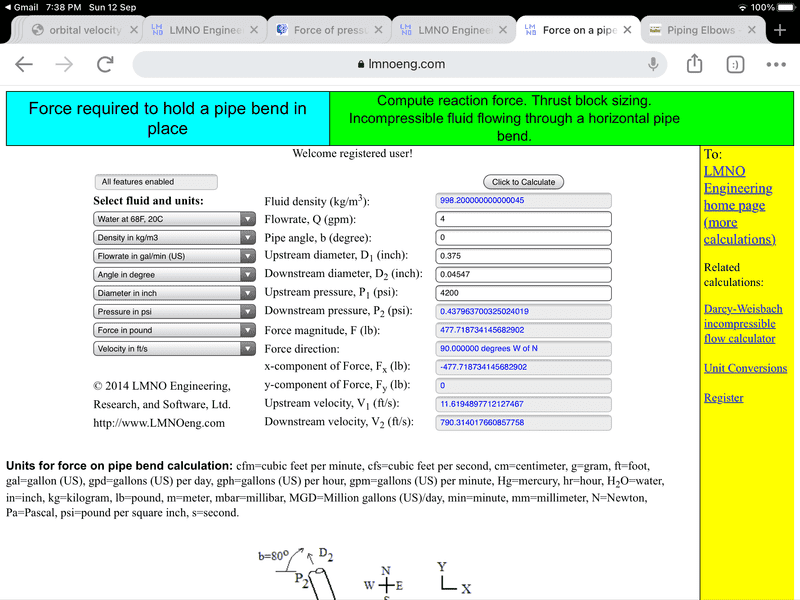 Here is the issue though. Another formula used for calculating the force required to hold a pipe in place because of the force produced on the bend due to the momentum of the water flow may, or may not, give a different answer.