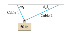 Calculate the magnitude of the force on cables 1 and 2 in the figure below if θ_1 = 55° and θ_2 = 35°.