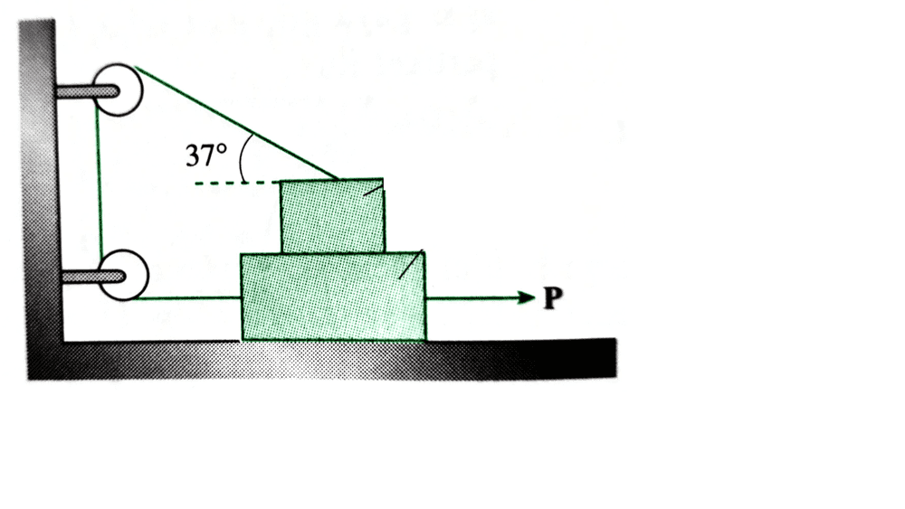 Smaller block has mass 1 kg and larger block has mass 2 kg. Coefficient of friction between the two blocks is 0.2 and between larger block and floor is 0.3. Find the value of P so that the two blocks move relative to each other at constant sped