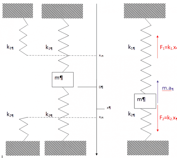 - One participant proposes an equation of motion for the mass and asks whether it is correct, specifically questioning the relationship between the spring constants k1 and k2.