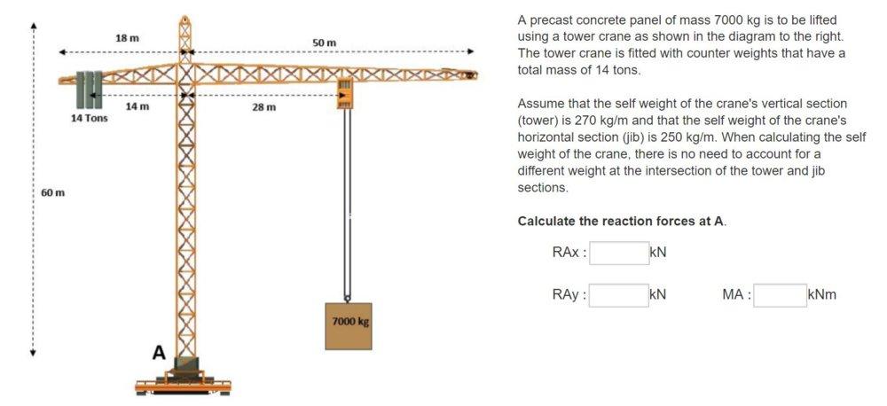 - Participants are attempting to calculate the reaction forces at the base of the crane, questioning whether to include the self-weight of different sections of the crane in their calculations. They are also discussing how to apply the concept of moments about a point, particularly in relation to the vertical and horizontal components of the crane.