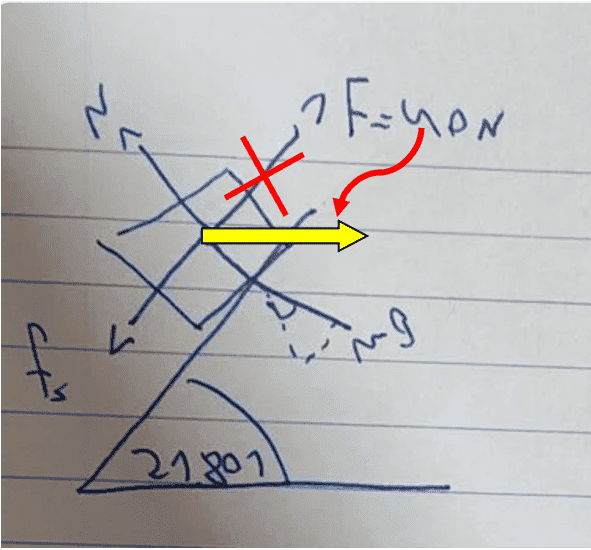 Now let's go back and consider the static situation again. Let the angle θ be the angle you calculated in the first part of this problem, θ. Assume that a horizontal (parallel to the surface of Earth) force directed to the right is applied to the block. This horizontal force [(F)\vec] has a magnitude of 40 Newtons. Calculate the force due to static friction, [(f)\vec]s for this new situation, assuming that the block does not slip. Define your coordinate system such that your answer is positive if [(f)\vec]s is directed up the plane, and negative if [(f)\vec]s is directed down the plane.