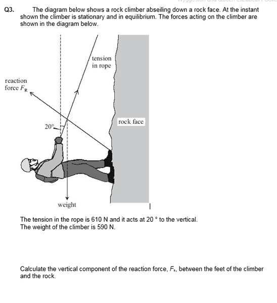 The discussion revolves around a physics problem related to mechanics, specifically focusing on the forces acting on a rock climber during abseiling (rappelling). Participants are attempting to determine the vertical reaction force in relation to the climber's weight and other forces involved.