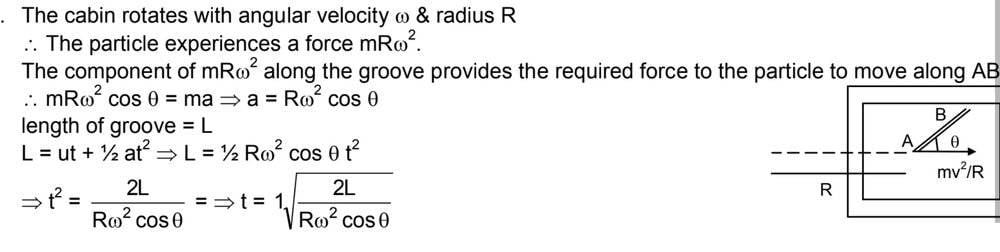 A table with smooth horizontal surface is fixed in a cabin that rotates with a uniform angular velocity ω in a circular path of radius R. A smooth horizontal groove AB of length L(<<R) is made on the surface of the table. The groove makes an angle θ with the radius OA of the circle in which the cabin rotates. A small particle is kept at the point A in the groove and is released to move along AB. Find the time taken by the particle to reach the point B.
