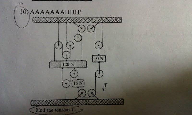 10) All I have figured out is if all three blocks were to be laid out on a flat surface, the three blocks would all move in one direction. I am unsure about what I'm supposed to do with all the pulleys. I was wondering if all I really needed to do was to focus on one block (the 20N one?). I am admittedly overwhelmed by how many pulleys there are.
