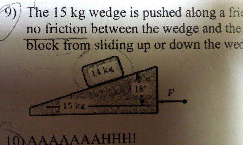 9) A 15 kg wedge is pushed along a frictionless surface. There is no friction between the wedge and the block. What force, F, is required to keep the block from sliding up or down the wedge?