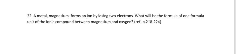 A magnesium ion has a 2+ charge and the oxygen atom has a 2- charge. The formula for the ionic compound is MgO.