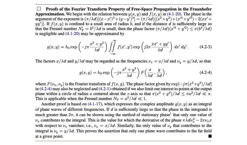If the distance between the input and the output screen d is large enough, then for a plane wave (with some spatial frequencies vx and vy) at the input, the spot at the output will be a point. But if the plane wave is confined (aperature size b in the picture), it's no longer a plane wave... but a sum of plane waves. The proof here mentions the method of stationary phase and a phase factor that goes to zero. Sure, the math works out, but I still don't get intuitively. The only think that makes sense is to treat the plane wave as a gaussian laser beam (and so the dots are also gaussians). But this is not consistent, since a laser beam consists of many plane waves at different angles and here it's clearly mentioned that just one plane wave / spatial frequency contribute to a given point... Thanks a lot for any insight!